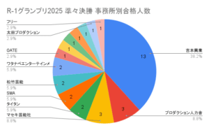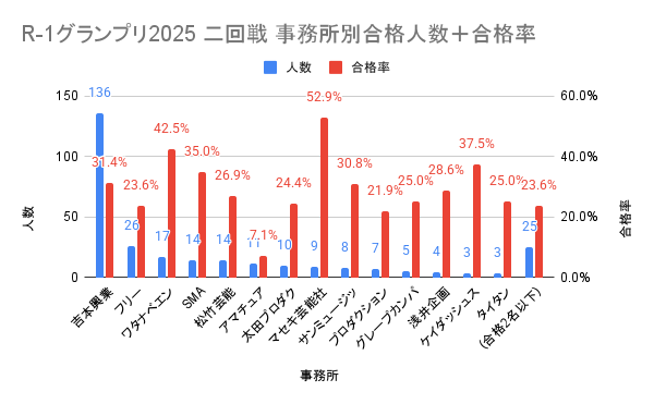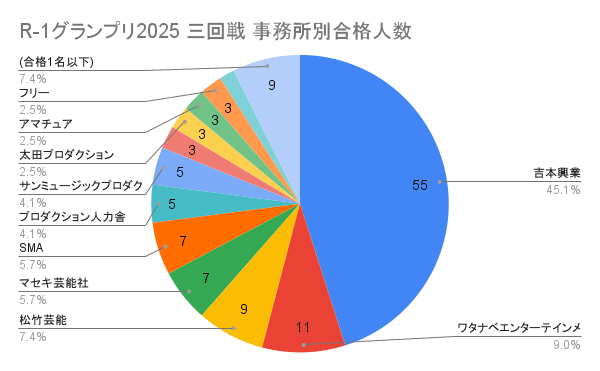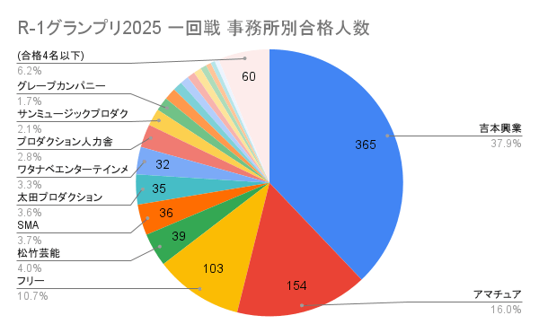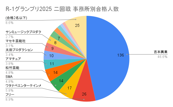 絶対数で言えば一大勢力吉本興業が圧倒的だが合格者のうち38%と例年よりやや少なめ