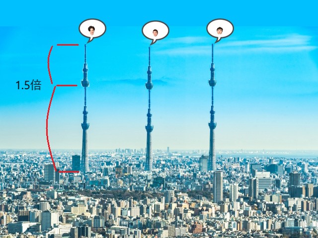 人間サイズの顔が、東京スカイツリーの約1.5倍の高さについてるのと同じくらい。