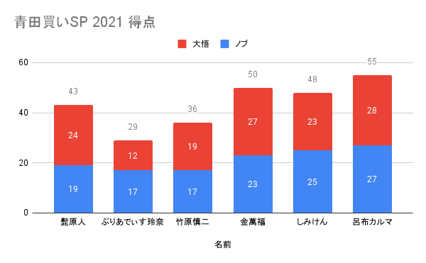 | 順位 | 名前 | 大悟 | ノブ | 点数 |