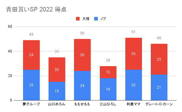 | 順位 | 名前 | 大悟 | ノブ | 点数 |