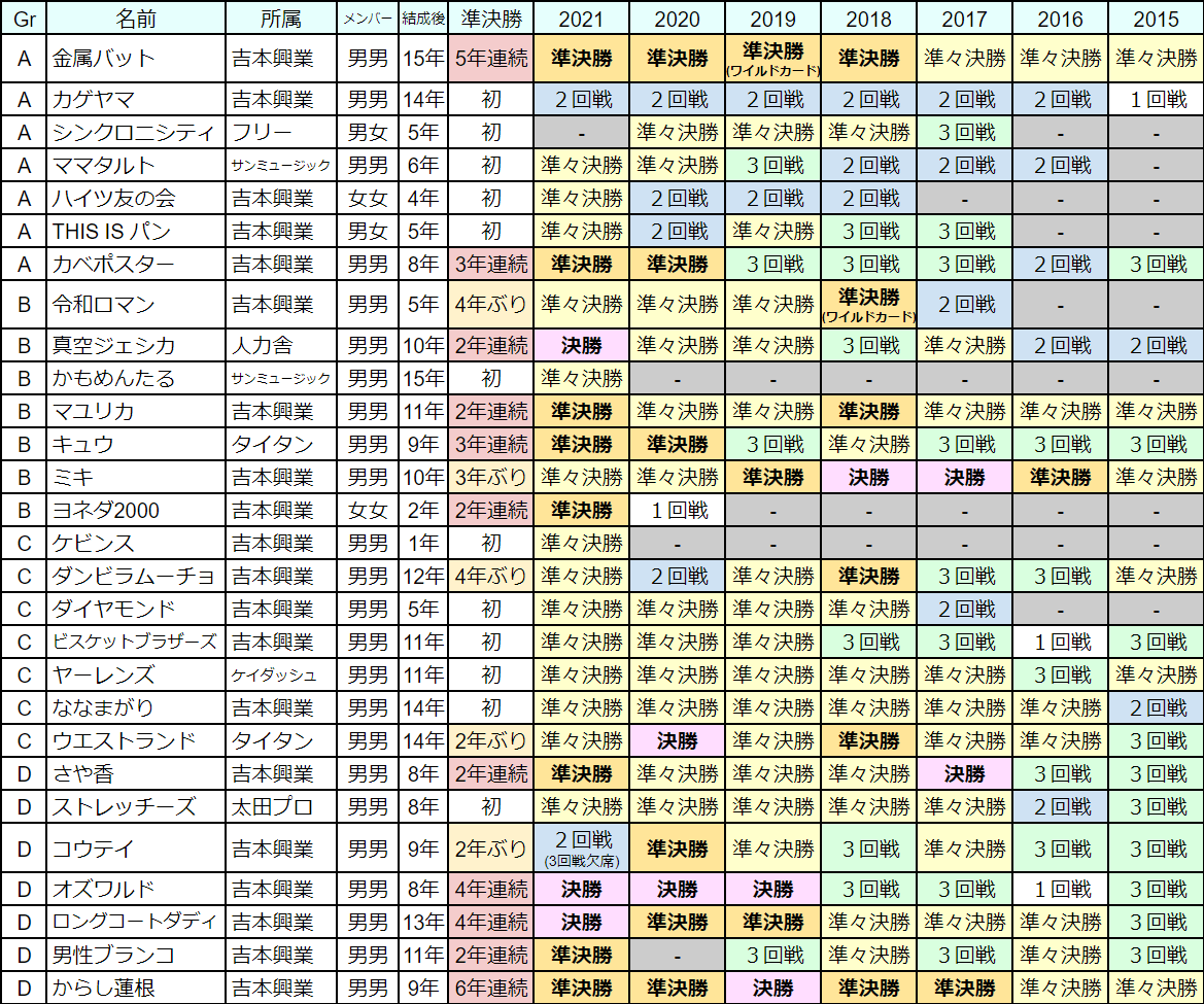 | A | 金属バット | 吉本興業 | 男男 | 15年 | 5年連続 | 準決勝 | 準決勝 | 準決勝 (ワイルドカード) |
