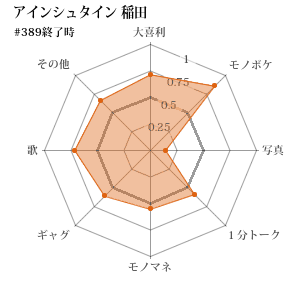 | 82 | 5 | 後 | 鬼越トマホーク 金ちゃん | モノマネ | 勝 | 38-16 (0.704) | 1668.7 |