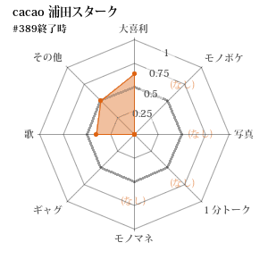| 387 | 5 | 先 | ザ・プラン9 浅越ゴエ | 大喜利 | 負 | 14-15 (0.483) | 1543.9 |