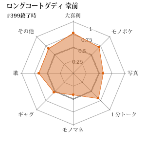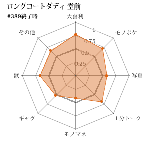 | 75 | 決勝 | 後 | 笑い飯 西田 | モノマネ | 負 | 42-23 (0.646) | 1693.6 |
